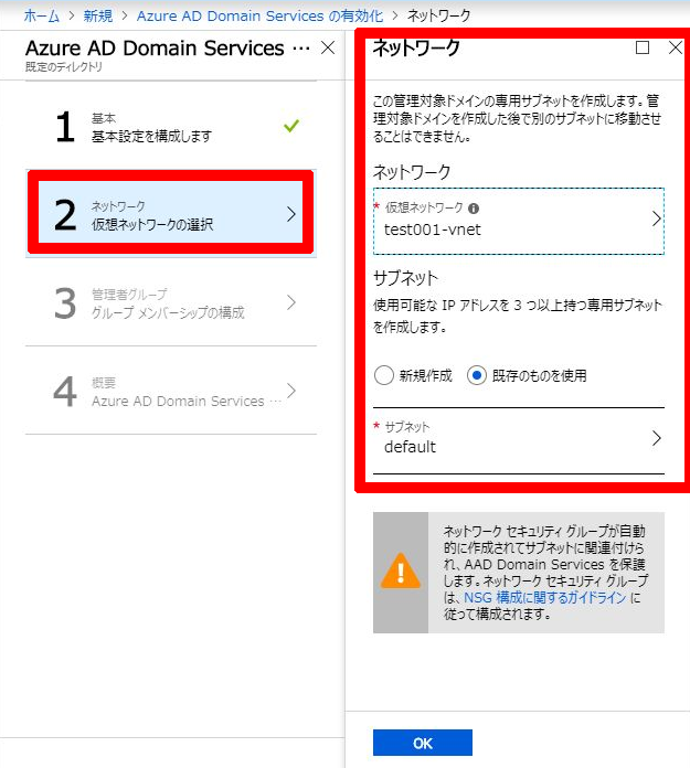 ここでは、Azure ADDSを利用するネットワークとサブネットを選択します。