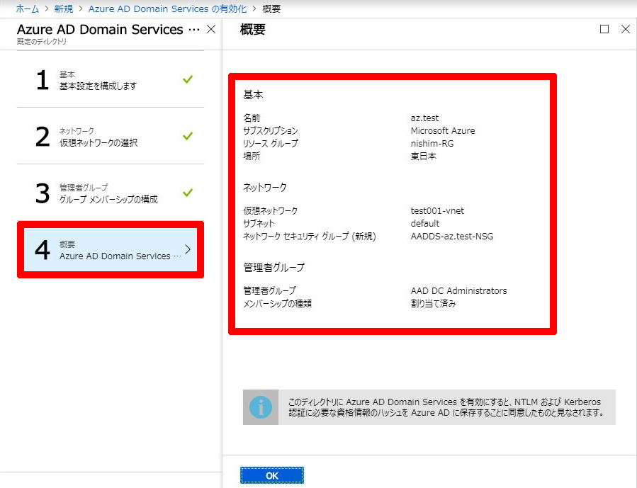 最後に確認画面となり、これまで設定した内容を確認し、「OK」をクリックすれば、Azure ADDSのデプロイが開始されます。