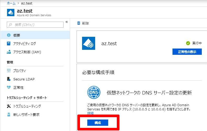 アクティビティログで「デプロイが完了しました」と表示された後に、デプロイされたAzure ADDSを確認すると、「マネージド ドメインをプロビジョニング中です」や「展開中」と表示されており、ここから10~20分程度待ってみると、無事に展開が完了した旨のメッセージが表示されました。