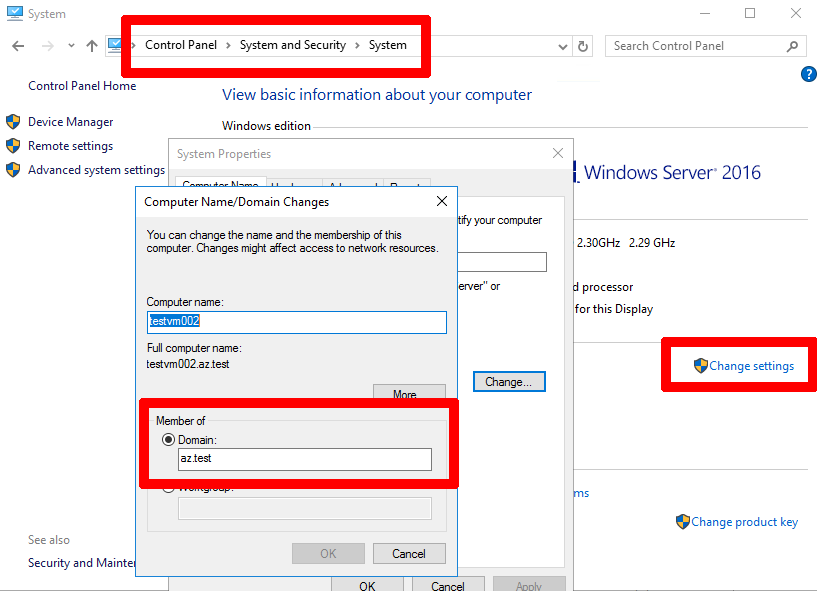 ローカル用の管理者アカウントで仮想マシンにRDPで接続しWorkgroupの変更画面にアクセス