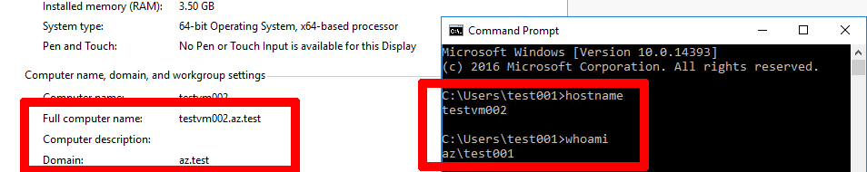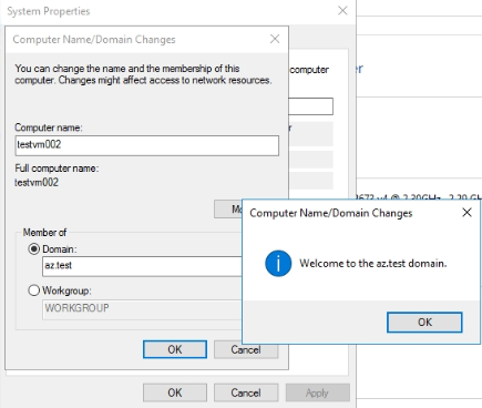 管理ユーザーのドメインはAzure ADのドメインか、今回作成したドメインか迷うところですが、今回作成したドメイン「az.test」のユーザー「test001」でドメインの参加ができました。
