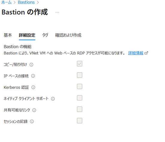 [詳細設定]タブのBastionの機能はDeveloper SKUの制限通りで変更することはできずグレーアウトされています。