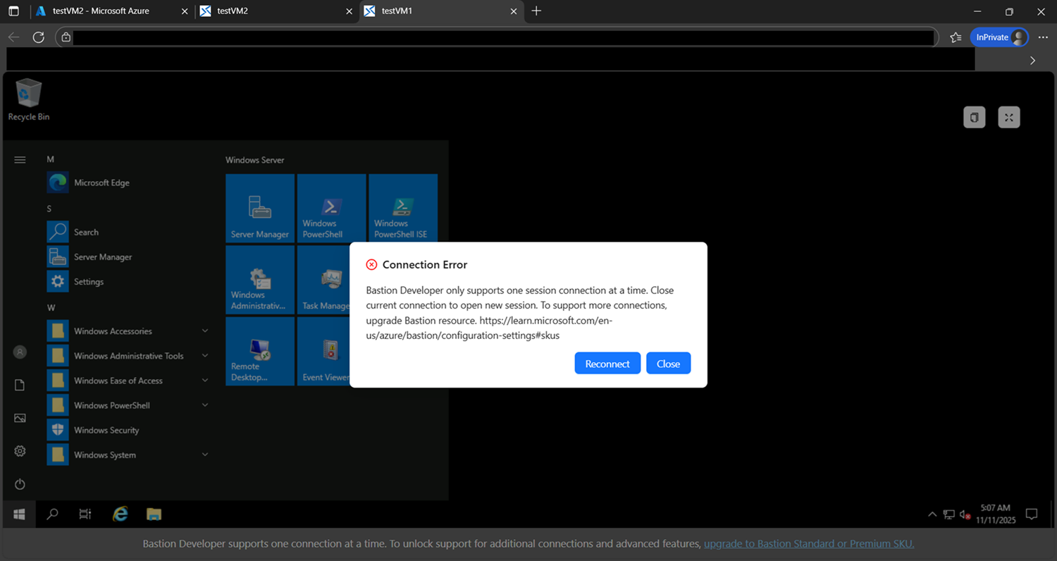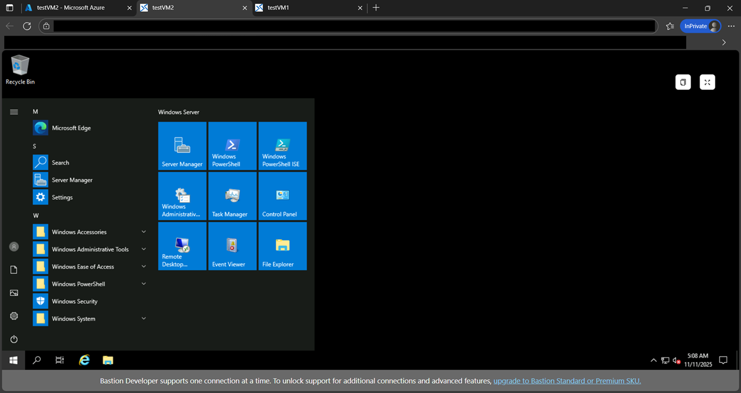 仮想マシンtestVM1に接続できました。画面下部に同時接続は1台の警告が表示され画面が少し圧迫されてしまいます。