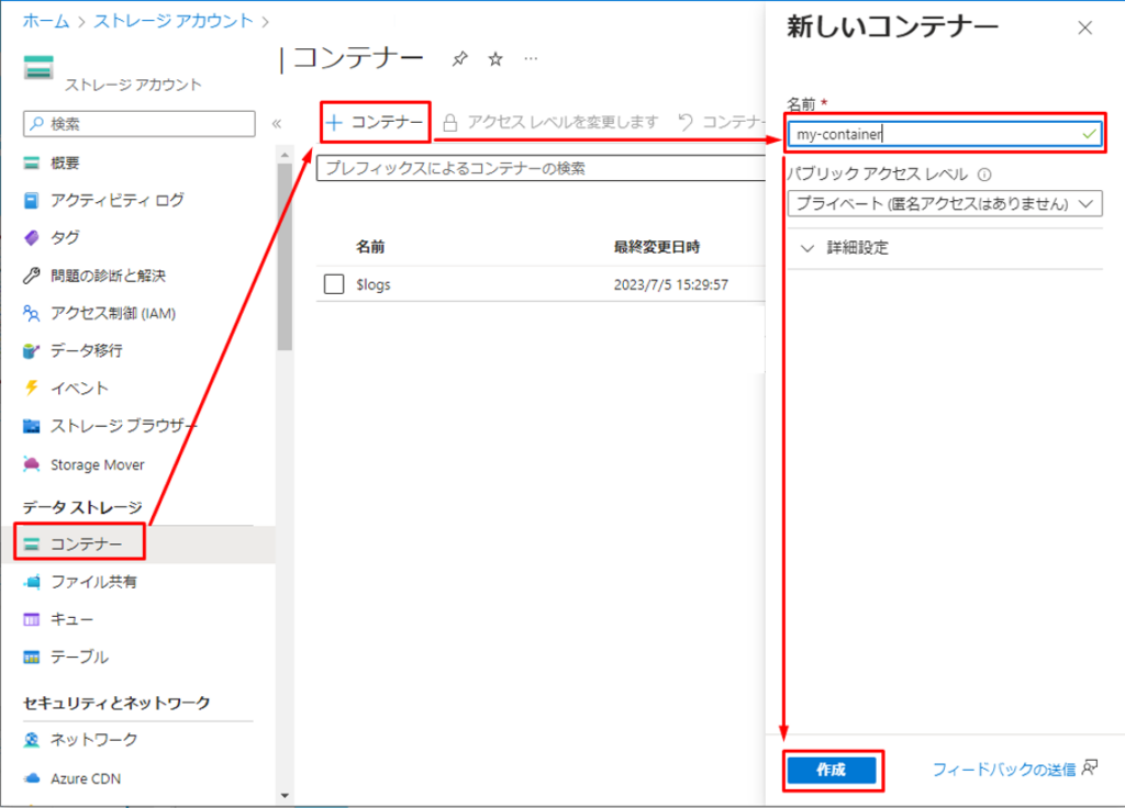 ① ストレージアカウントのポータル画面で「コンテナー」をクリックして、「コンテナー」をクリックします。