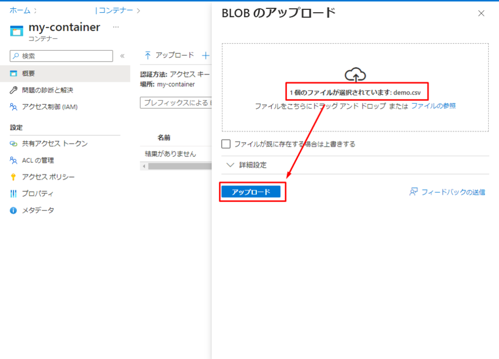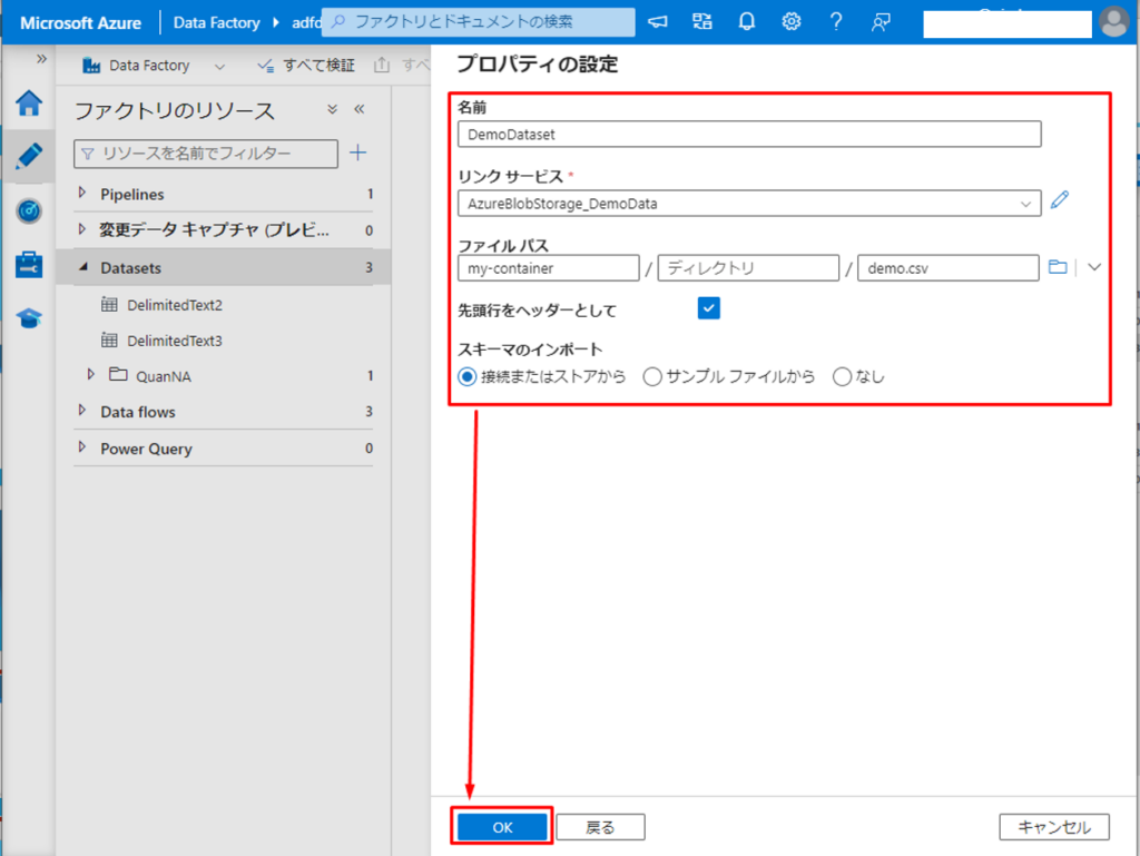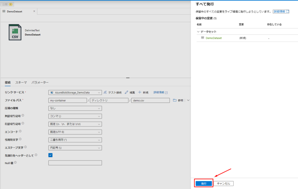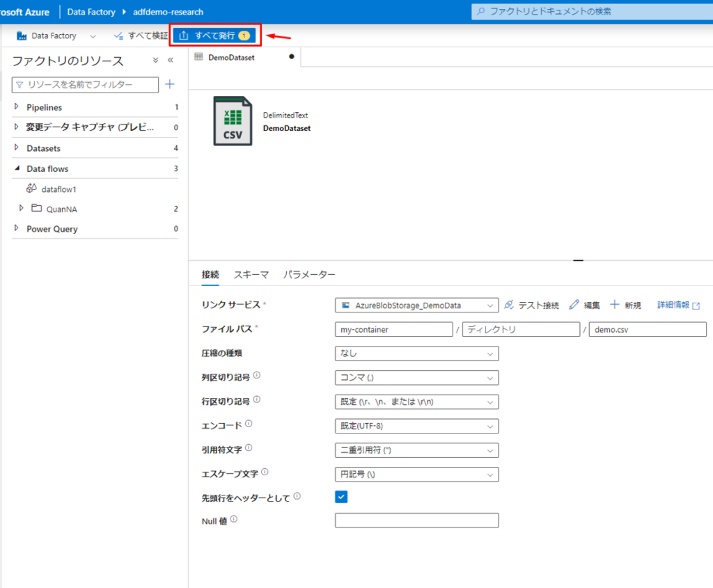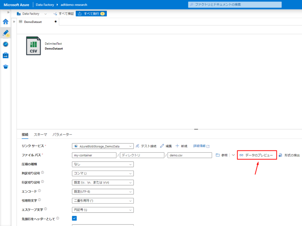 このデータセットはストレージアカウントからデータを取得するので、以下の手順でdemo.csv ファイルをストレージアカウントへ取込んでください。