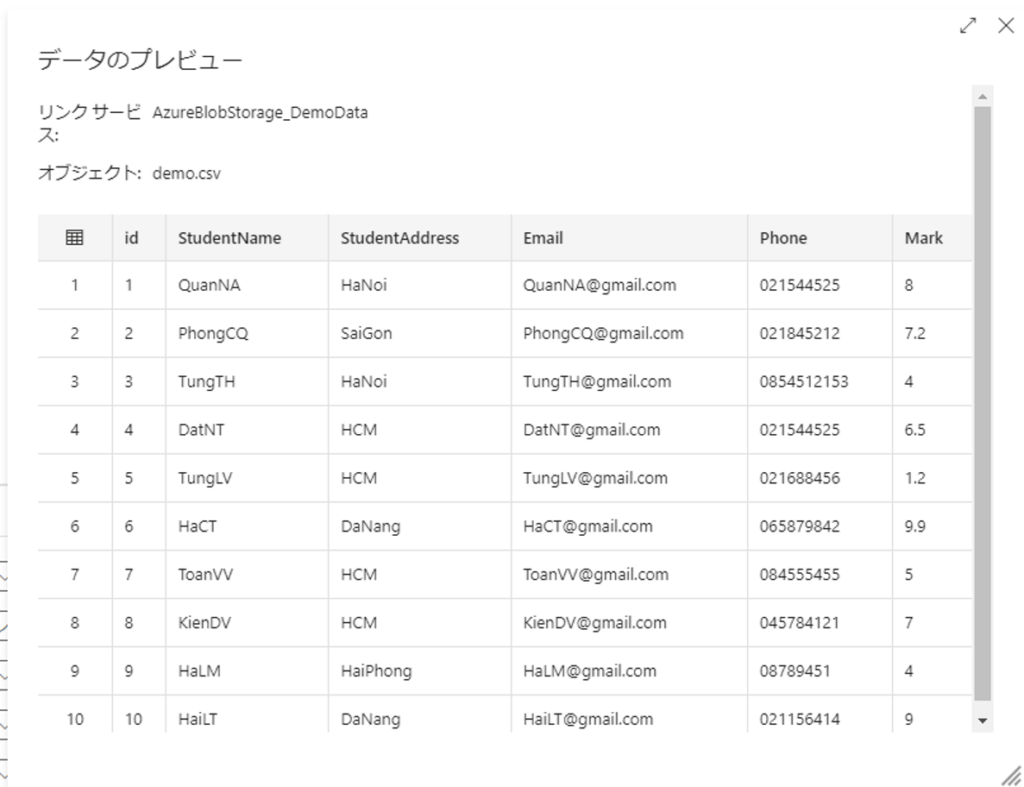 ⑧ demo.csv ファイルに含まれたデータセットは画像の通りです。このデータセットを使用して、 Azure Data Factoryでインラインビュー、サブクエリーを実現します。