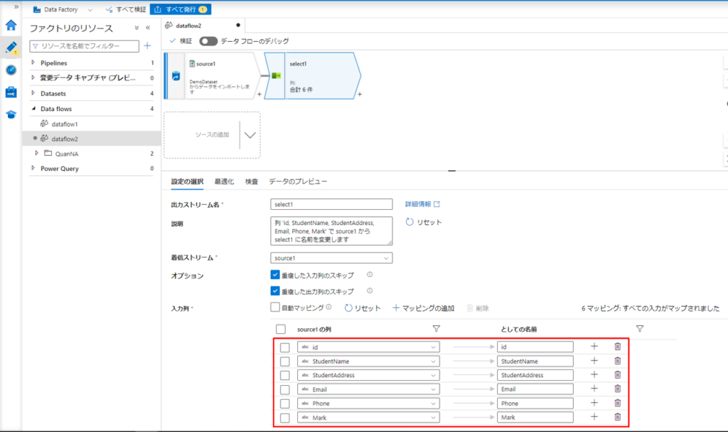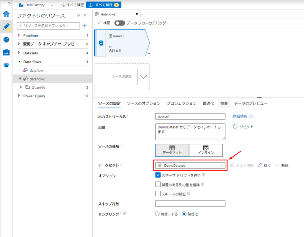 Azure Data Factoryでインラインビュー、サブクエリーを実現するために、1つのデータセットの作成が必要です。