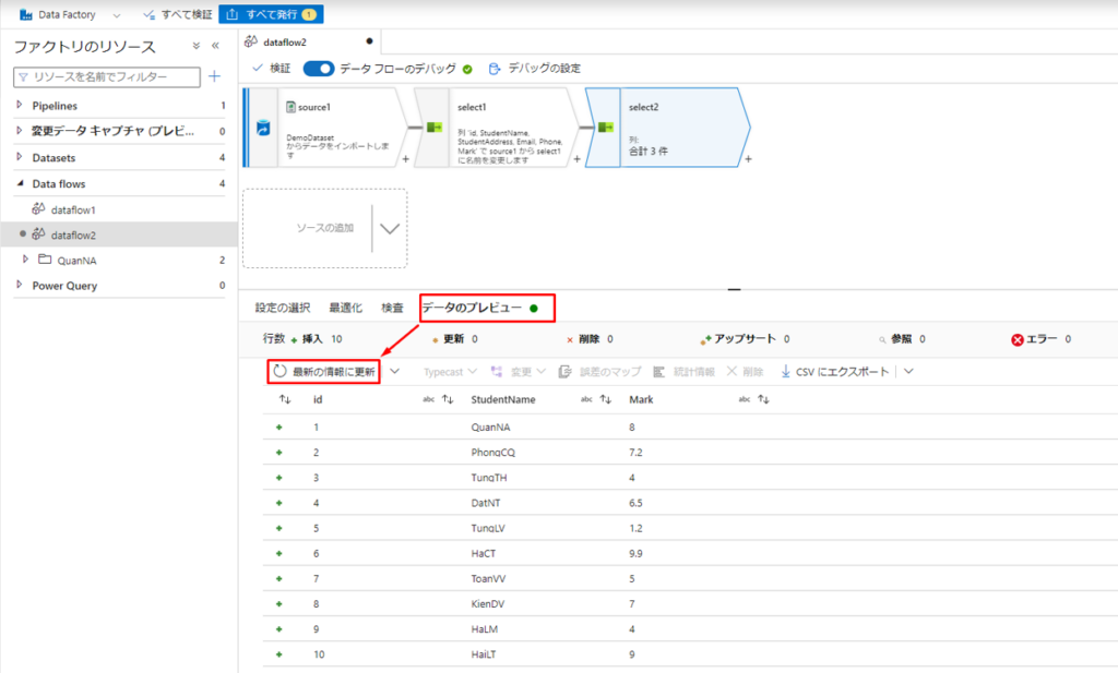 ⑱「データのプレビュー」をクリックして「最新の情報に更新」を選択すると、 「mark > 5」での StudentのIDとStudentName が表示されます。