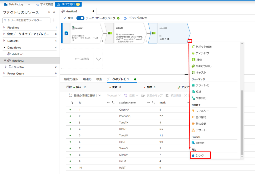 ⑪ ADFでインラインビューの実現が完了しました。実現後、シンクで変換したデータを保存します。