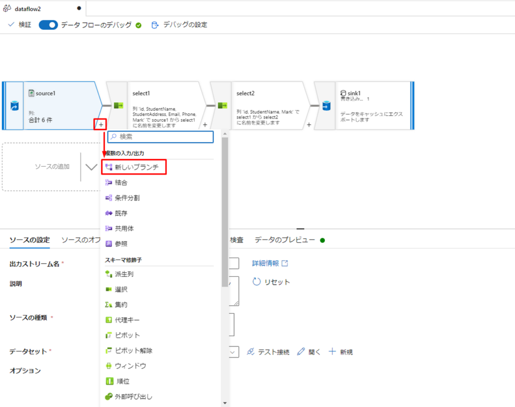 ① データソースでの アイコンをクリックして、「新しいブランチ」を選択します。データソースの新規ブランチが作成されます。