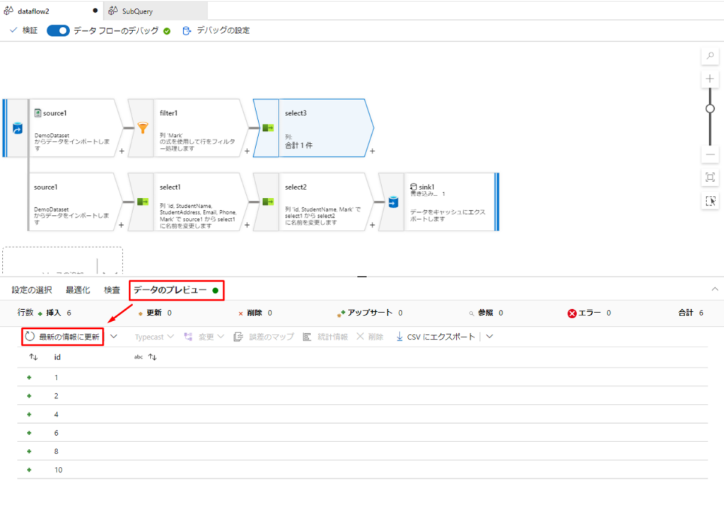 ⑦「データのプレビュー」をクリックして「最新の情報に更新」を選択すると、 「mark > 5」での StudentID の一覧が表示されます。