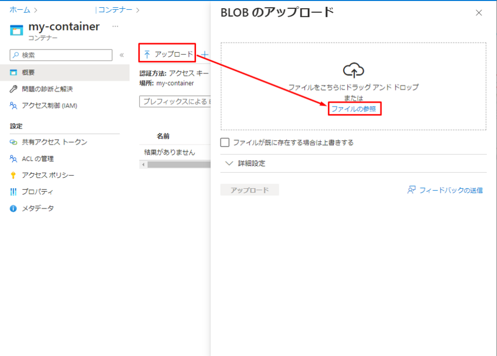 ⑤「アップロード」をクリックして、「ファイルの参照」をクリックします。