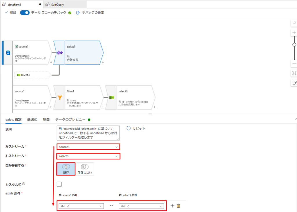 ⑫「exists条件」項目で id を2つのドロップダウンに選択します。