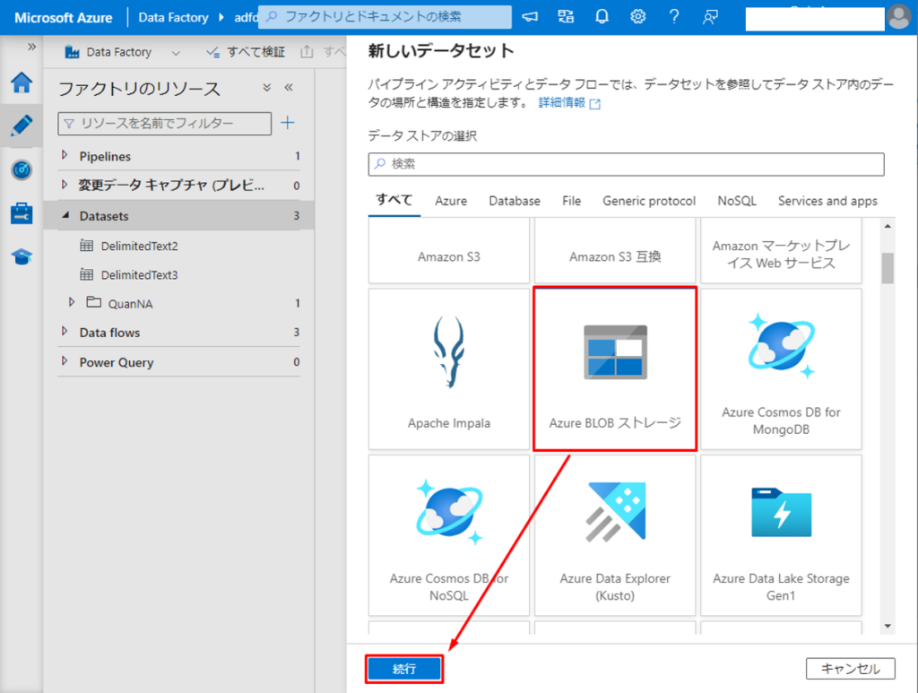 ②「Azure BLOB ストレージ」を選択して、「続行」をクリックします。