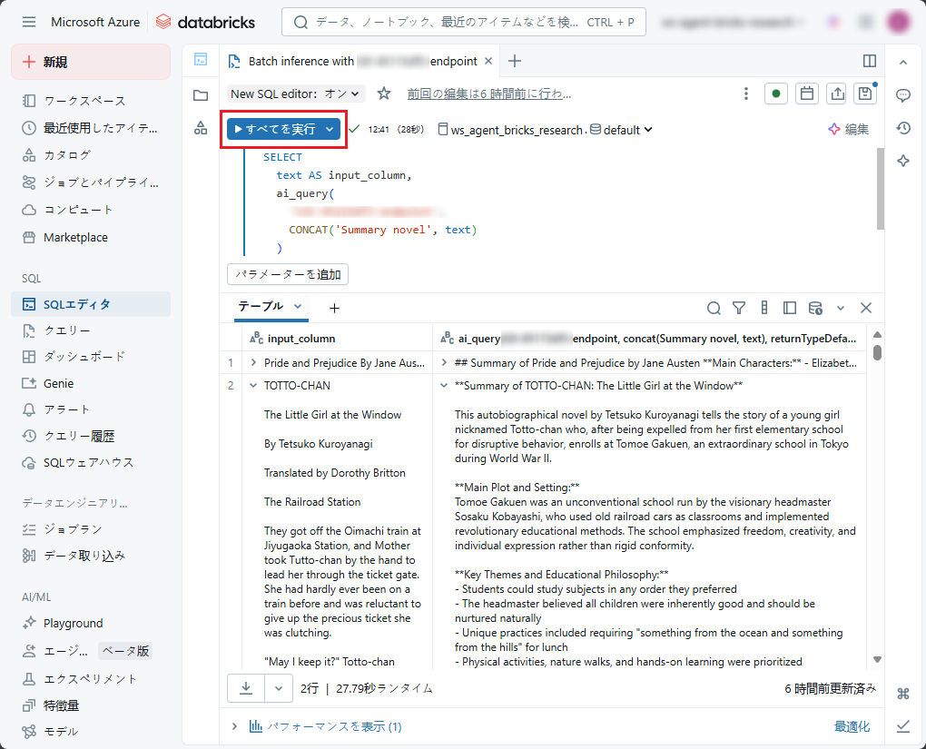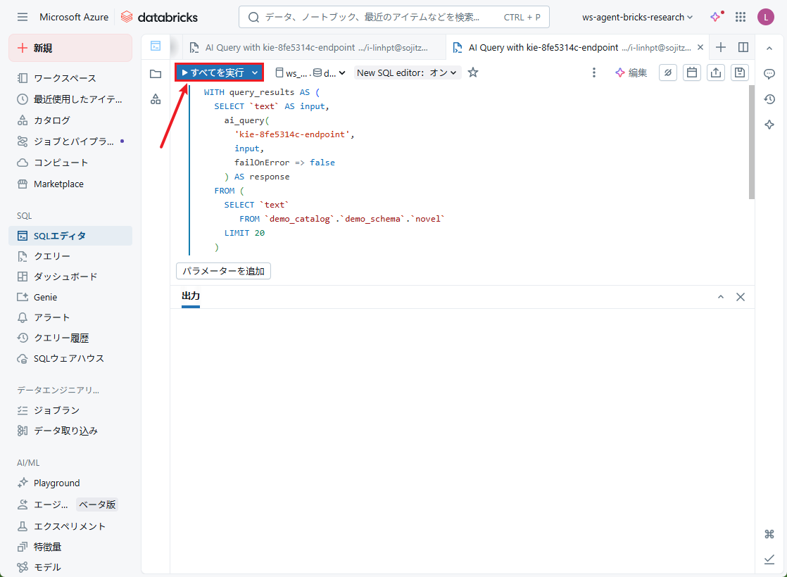 • 「すべてのドキュメントのデータを抽出」:SQLエディタでai_queryを実行して情報を抽出します。