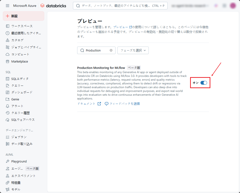 MLflow (ベータ) の運用監視(Production Monitoring) が有効になっていること。