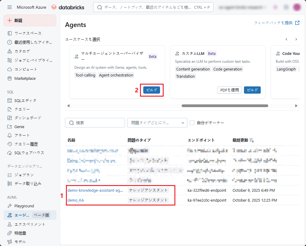 (1)でKnowledge Assistantエージェントが利用可能な状態であることを確認したら 、 (2) 「マルチエージェントスーパーバイザー」で 「ビルド」をクリックして、マルチエージェント スーパーバイザーを構築します。