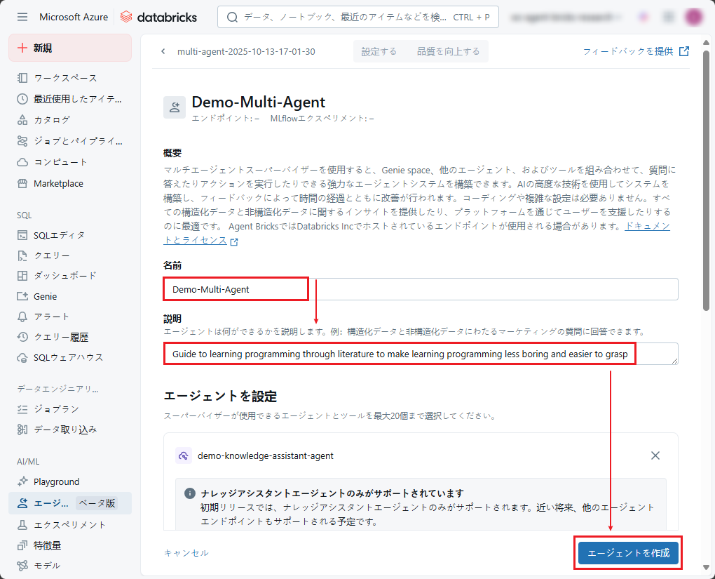 マルチエージェント スーパーバイザーシステムを作成するため、最初にGenieスペースまたは Knowledge Assistantエージェントを事前に作成する必要があります。