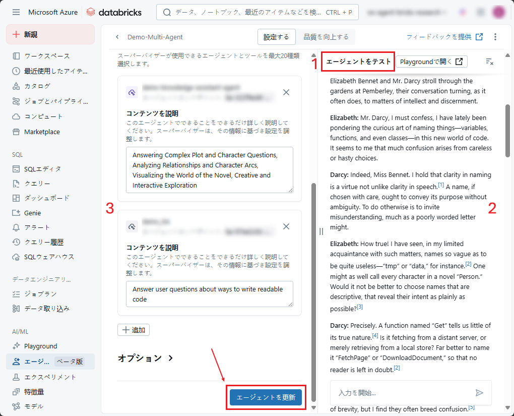 スーパーバイザーのビルドが完了したら、 AI Playground または右側の 「エージェントをテスト」ウィンドウでテストできます。