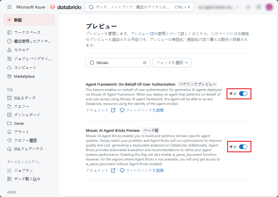 • ワークスペースでMosaic AI Agent Bricks Preview(ベータ版)機能が有効になっていること。