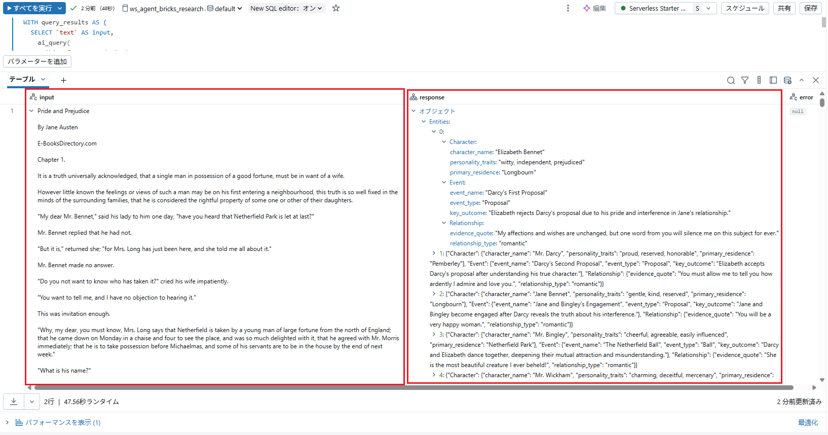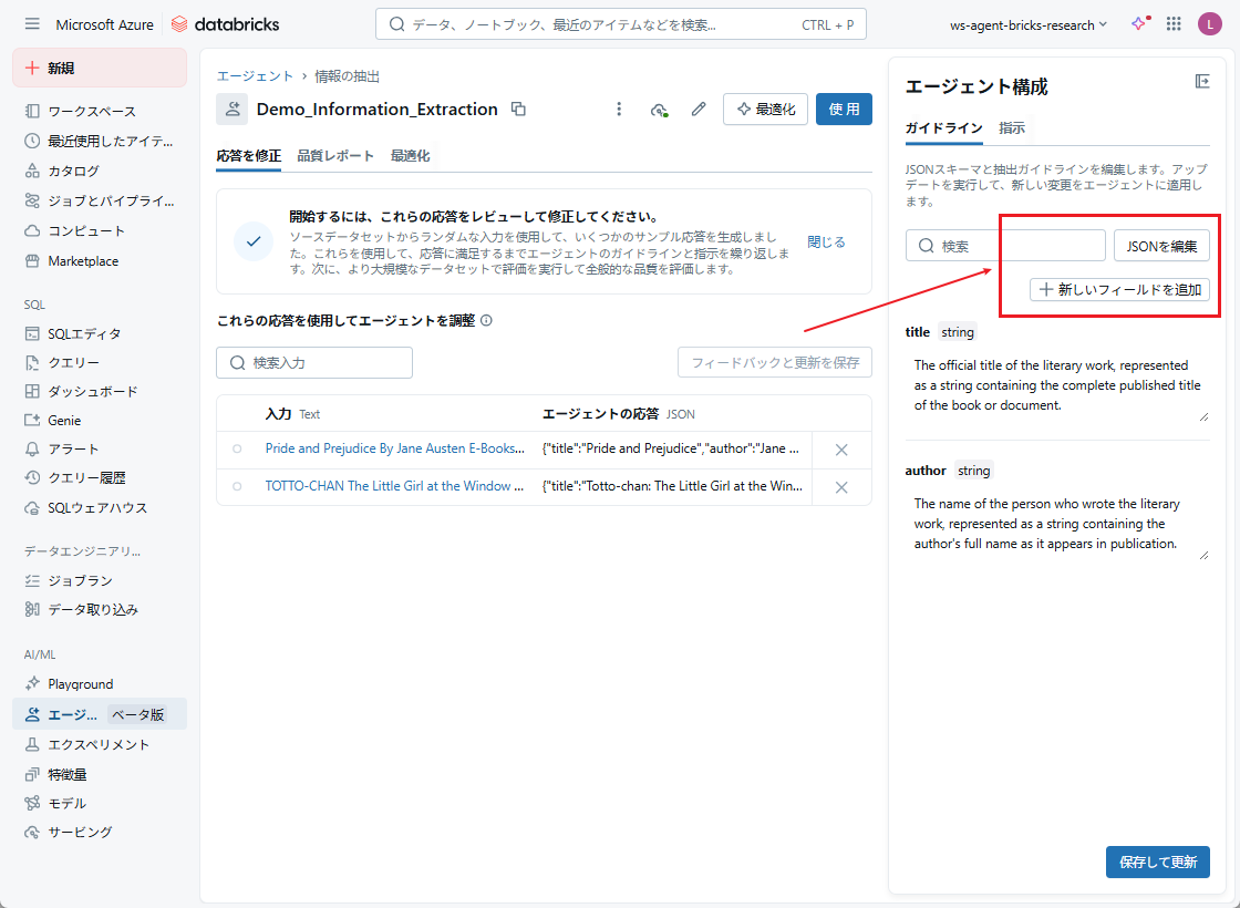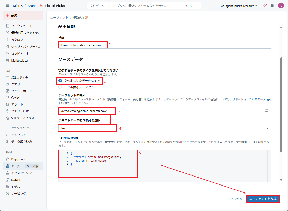 入力データを指定すると、「JSON出力の例」フィールドに抽出されたデータを含むサンプルJSONが自動生成されます。内容を確認し、問題なければ、「エージェントを作成」をクリックします。