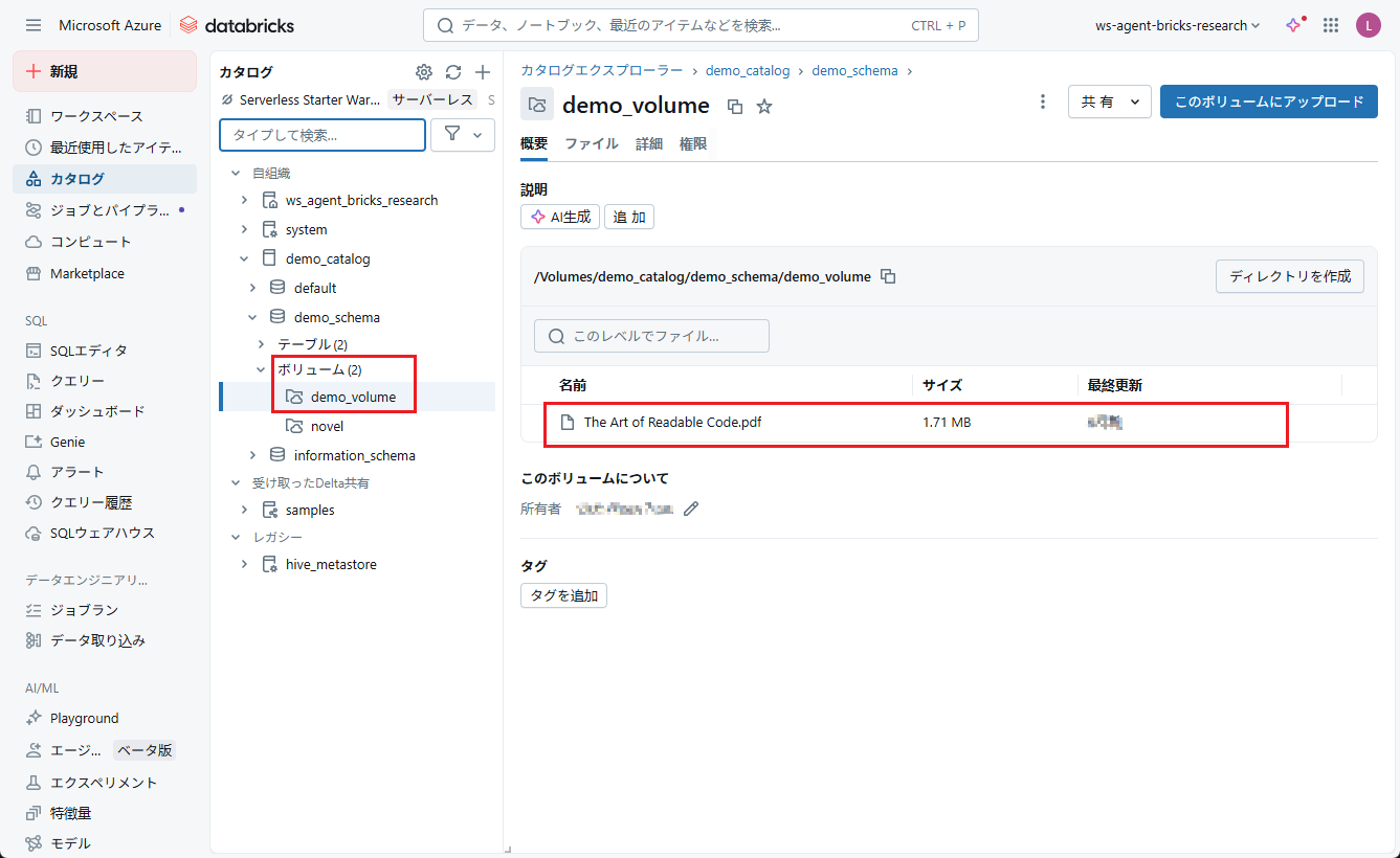 PDF形式のデータはカタログボリュームにアップロードします。