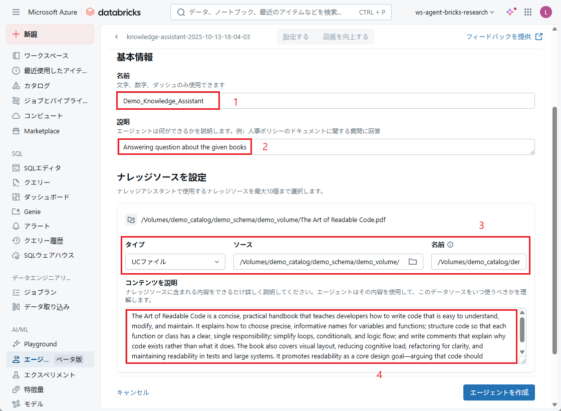 ステップ1:Knowledge Assistantエージェントを作成します。