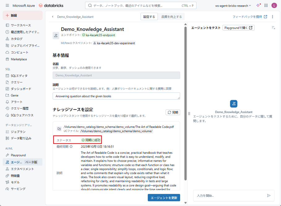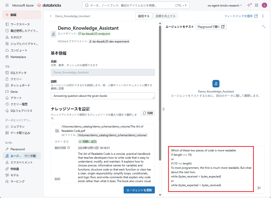 本記事では、前のセクションで作成した Knowledge Assistantエージェントを使用します。