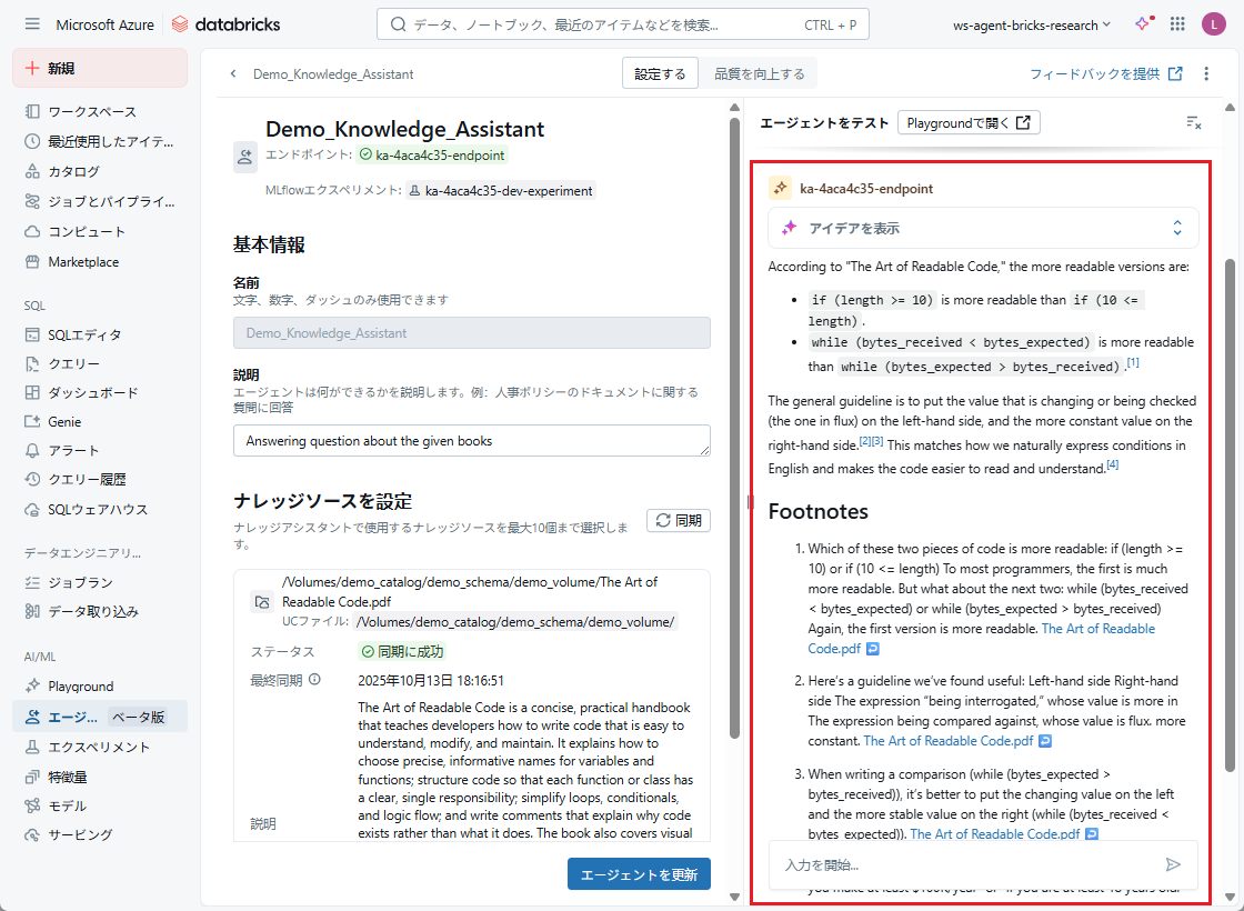 Agent Bricksのナレッジアシスタント(Knowledge Assistant)は、ドキュメントに基づいて明確な引用付きで質問に答えるチャットボットを作成するツールです。