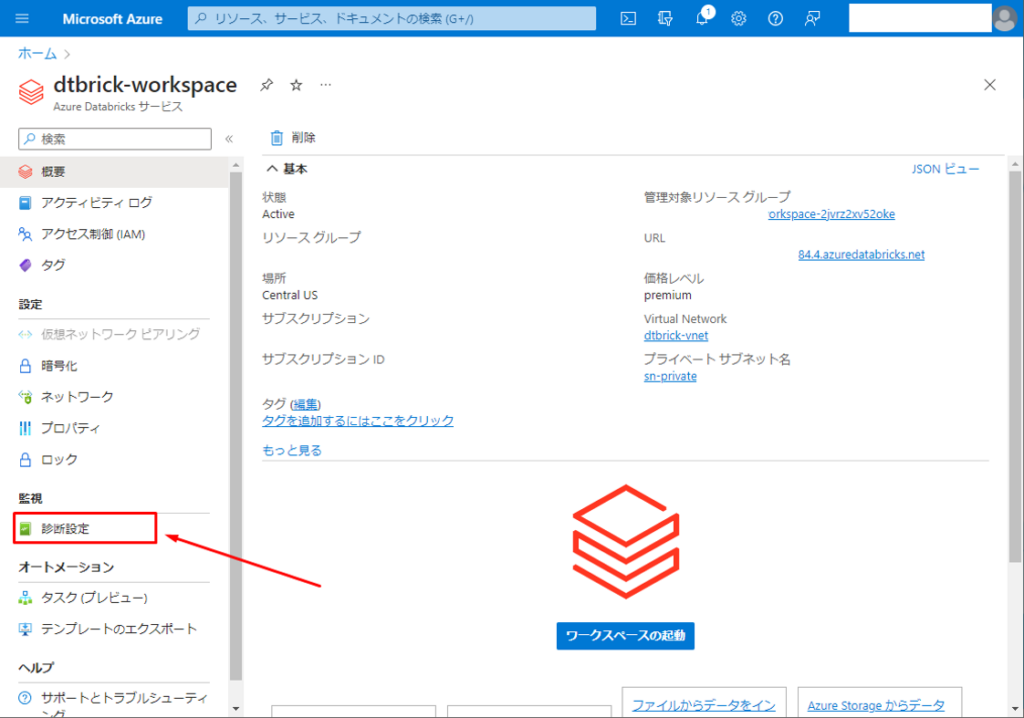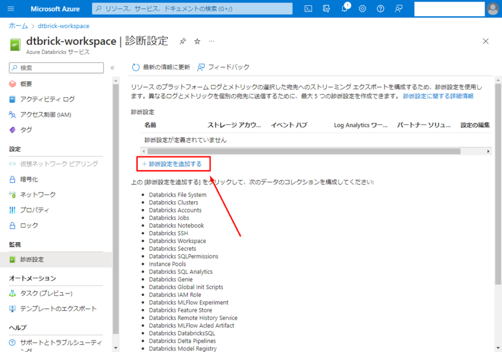 ① Databricks ワークスペースの Portal 画面で「診断設定」をクリックします。