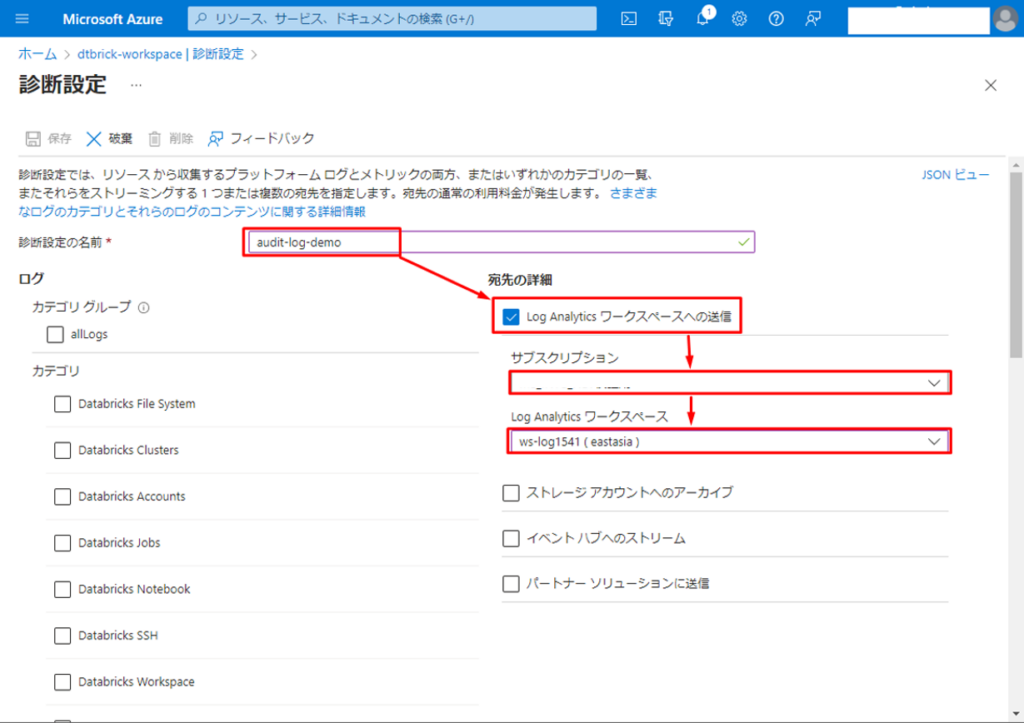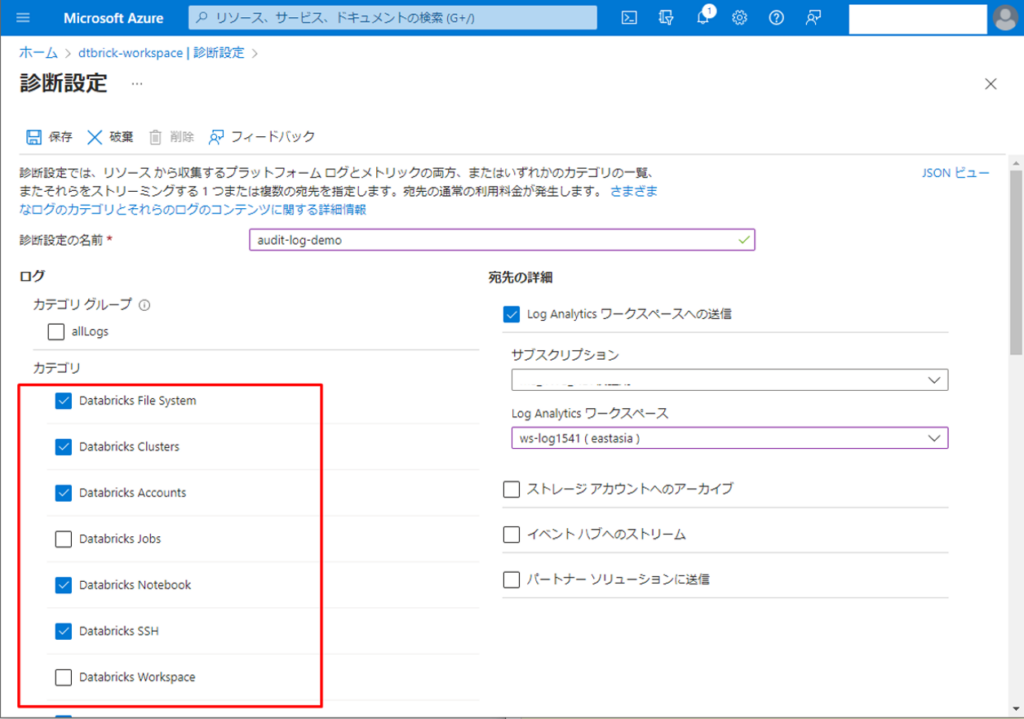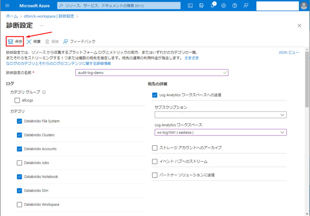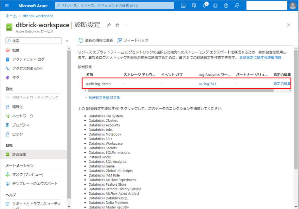 次は、Databricks のログをLog Analytic ワークスペースへ送信する診断設定の作成方法について説明していきます。