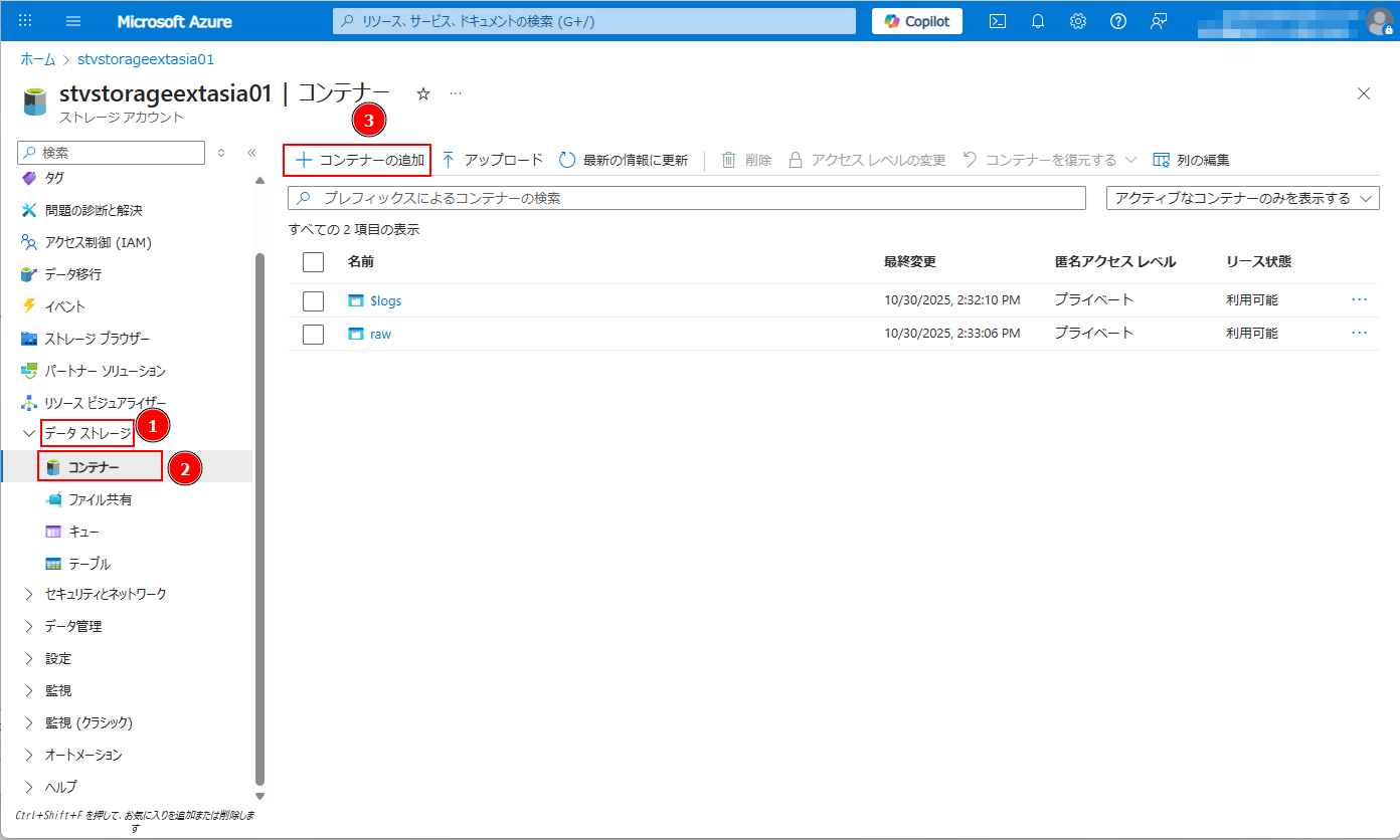 ① ストレージアカウントの画面から >「データ ストレージ」→ 「コンテナー」→ 「コンテナーの追加」をクリックします。