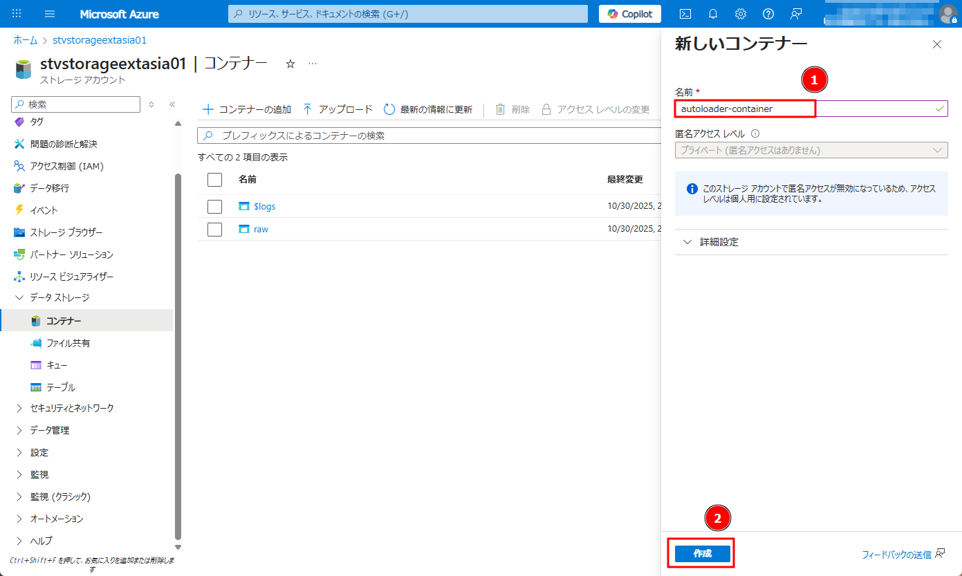 ②「autoloader-container」というコンテナー名を付けます。「作成」をクリックします。