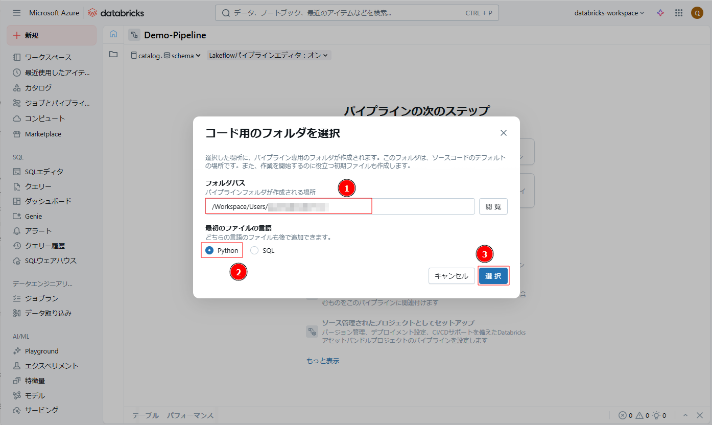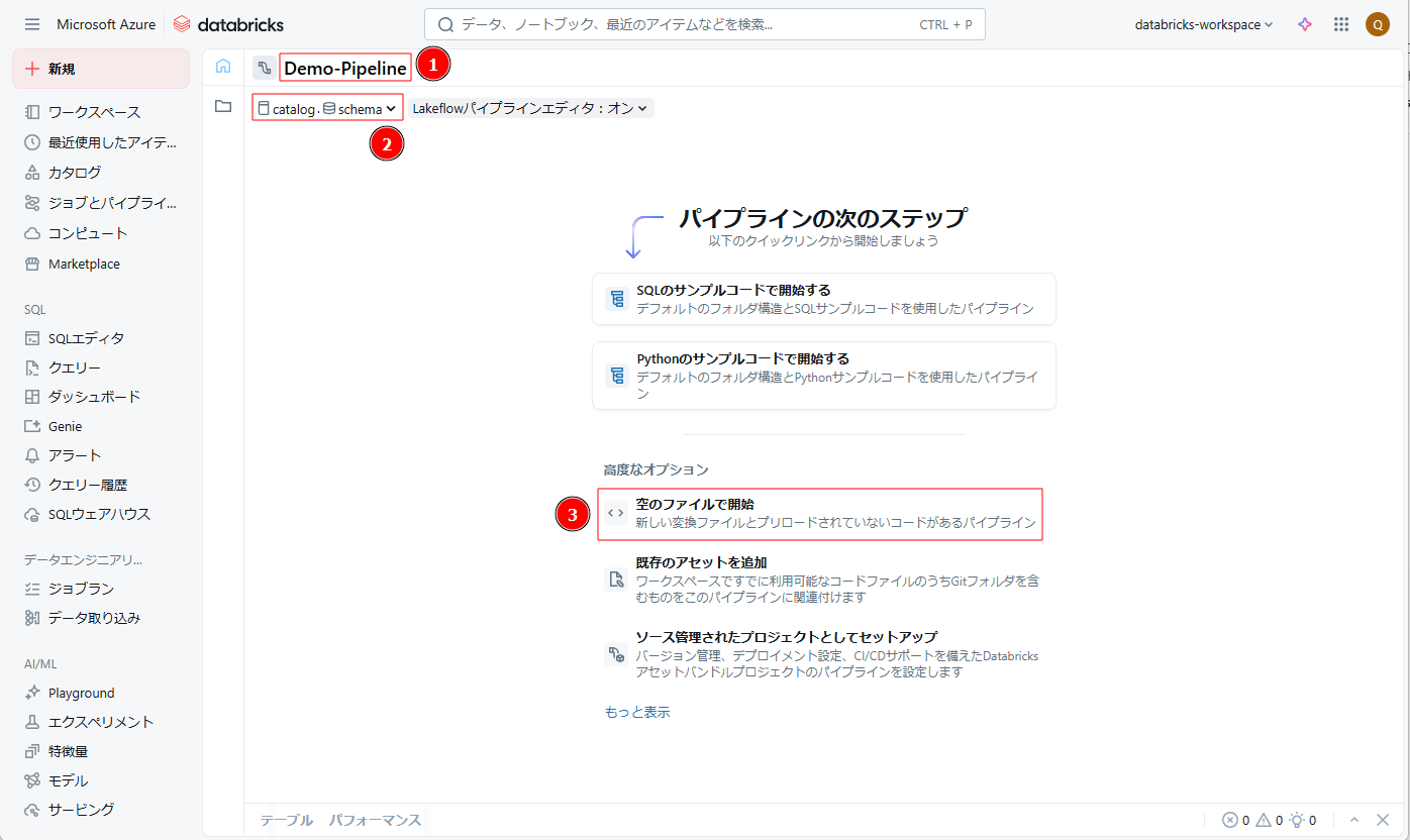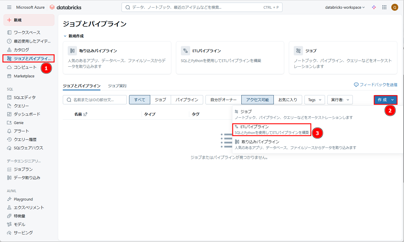 ① Databricksワークスペース画面から → 「ジョブとパイプライン」→「作成」→「ETLパイプライン」をクリックします。