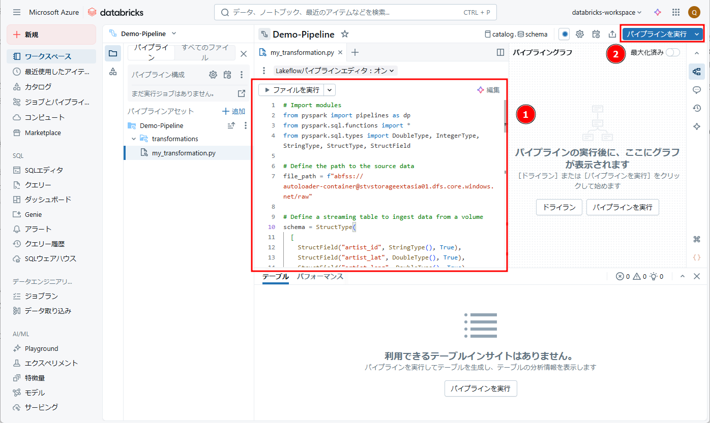 ④ 次のコードをコピーしてソース ファイルに貼り付けます。「パイプラインを実行」をクリックします