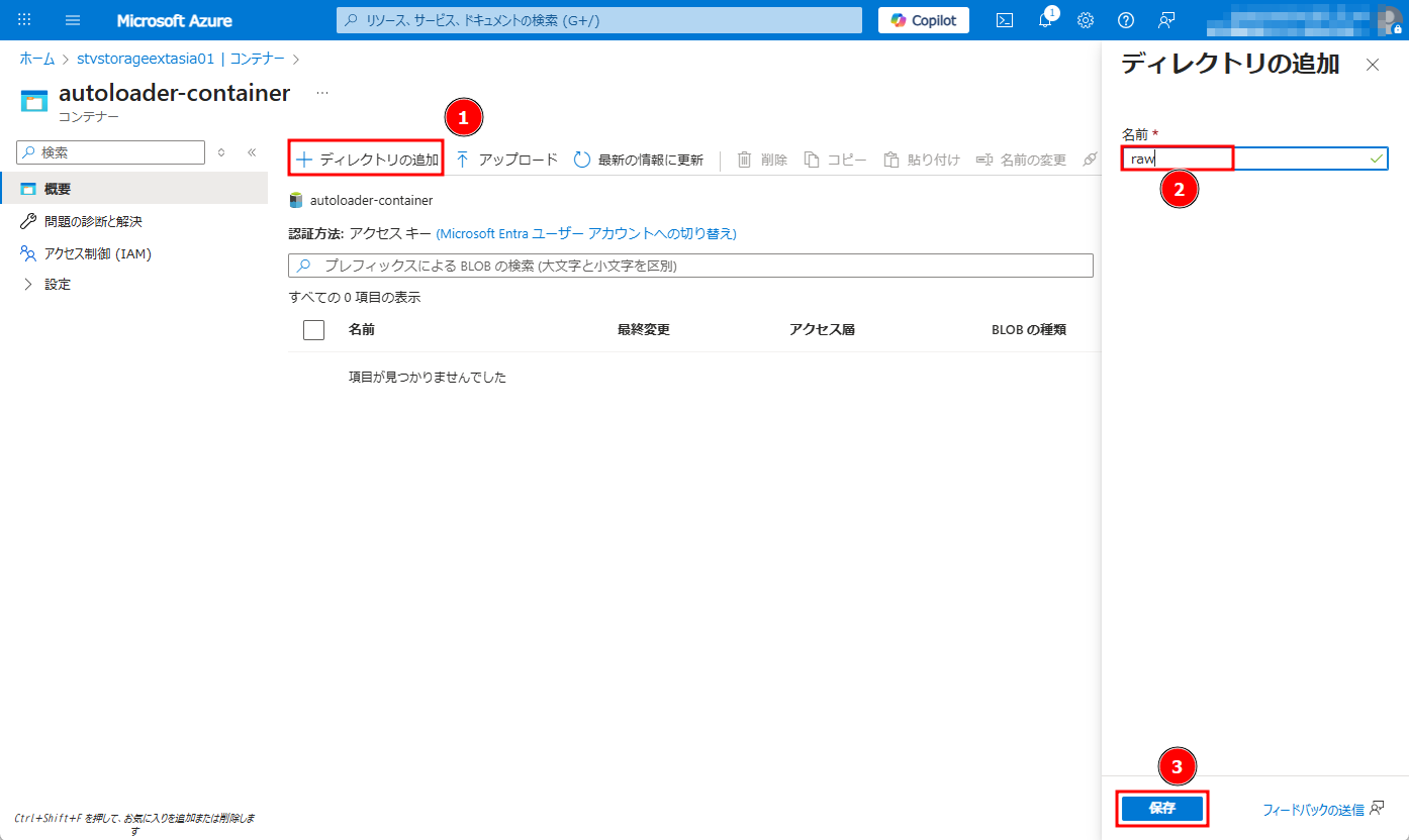 ③ コンテナーでフォルダーを作成するには、「ディレクトリの追加」をクリックします。