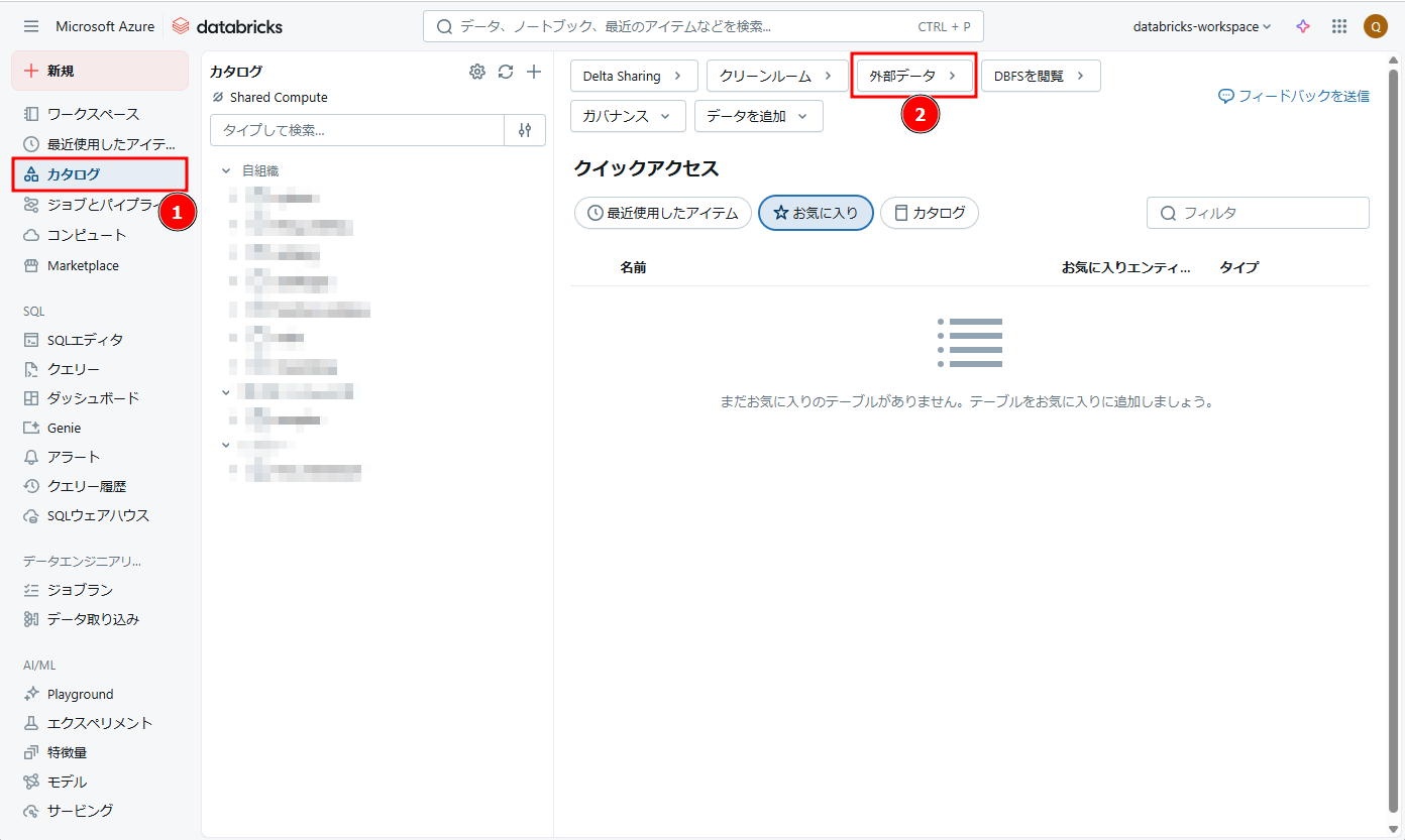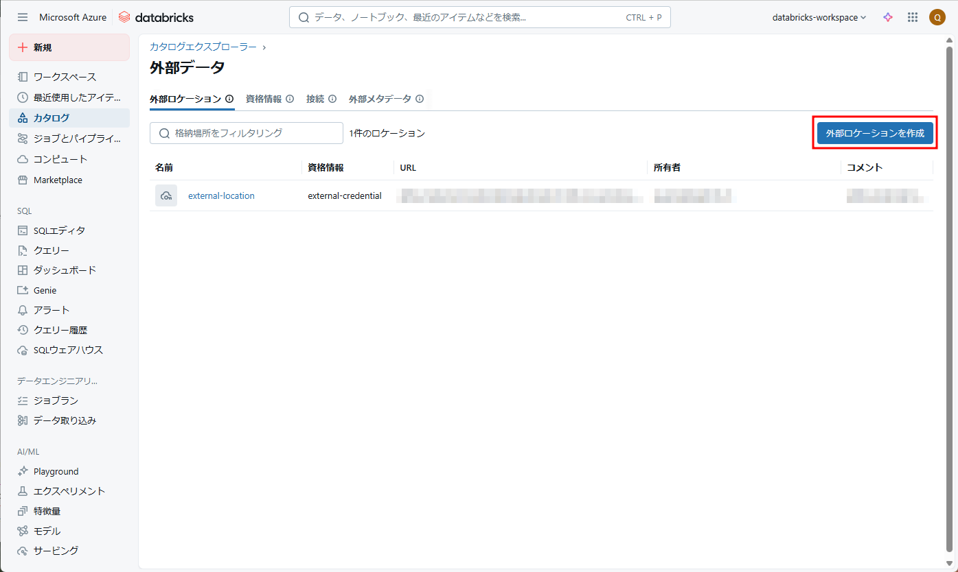 ① Azure Databricksの画面から →「カタログ」→「外部データ」→「外部ロケーションを作成」をクリックします。