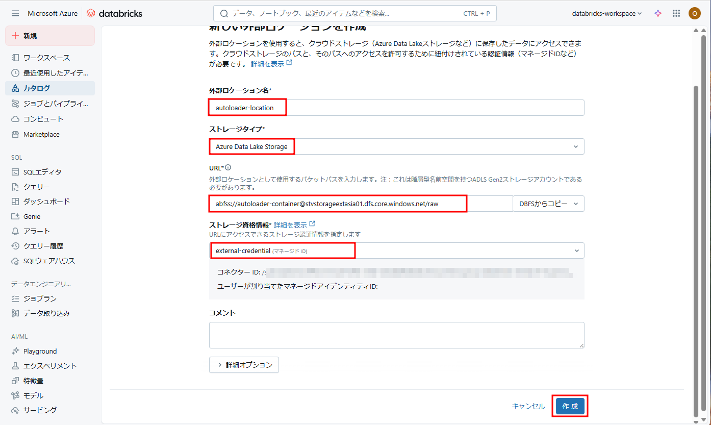 • 「外部ロケーション名」→ 「autoloader-location」という外部ロケーション名を付けます。