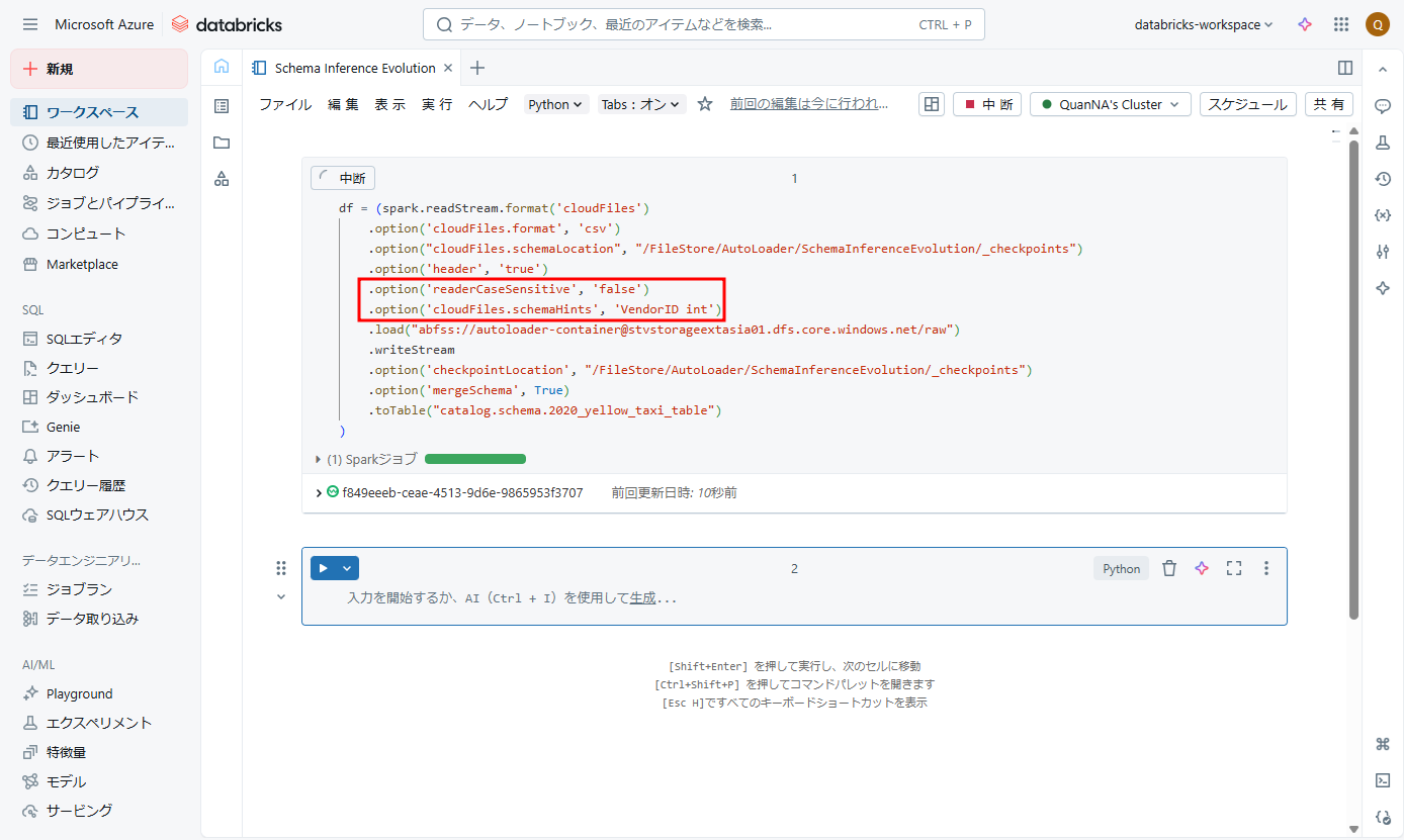 ② オプション [cloudFiles.schemaLocation] にターゲット ディレクトリを指定すると、スキーマの推論と進化が可能になります。