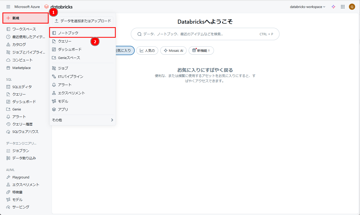 ① 最初、Databricks ワークスペースでノートブックを作成します。