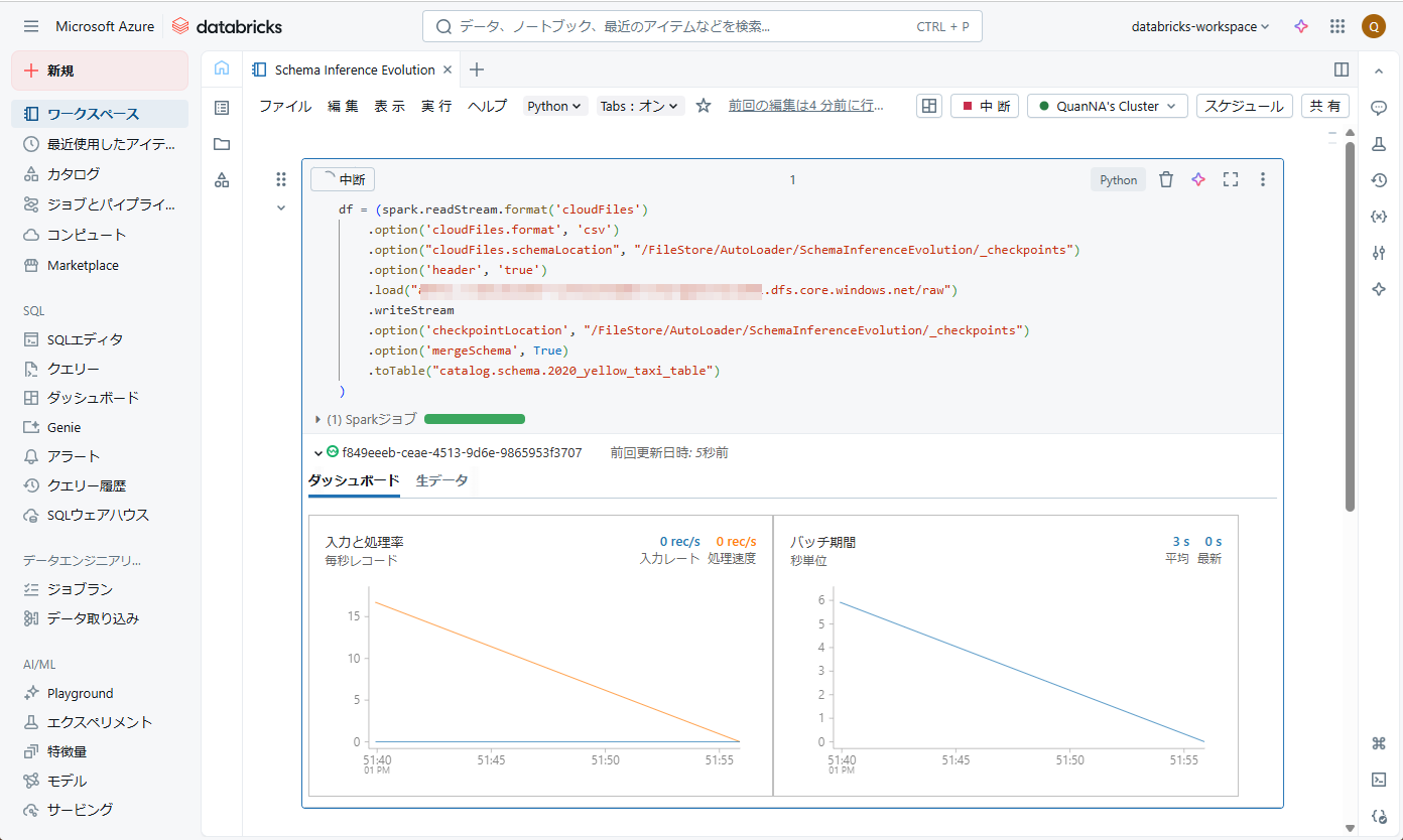 [Dashboard] タブで、AutoLoader が新しいファイルを検出し、進化を実行していることが表示されます。