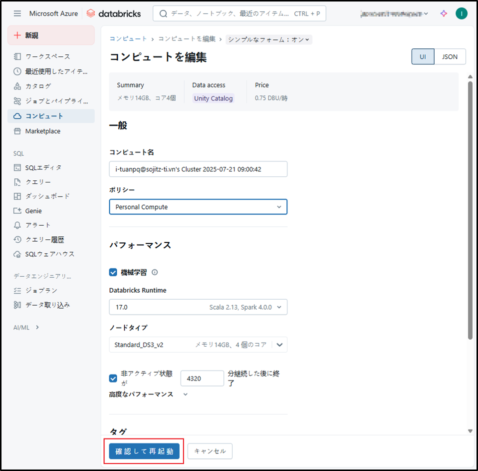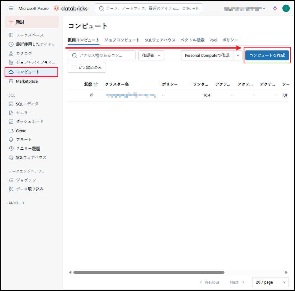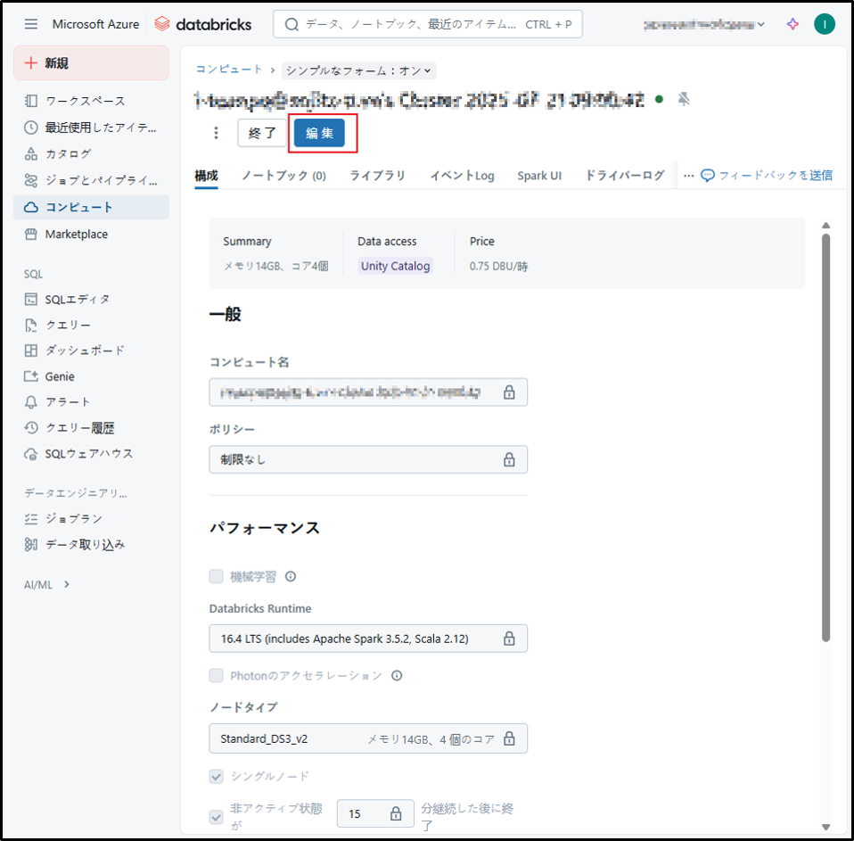 参考URL:クラスターの管理 – Azure Databricks | Microsoft Learn