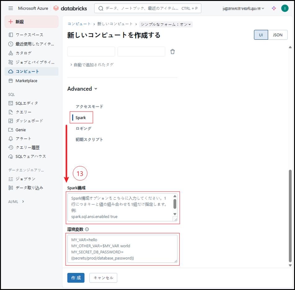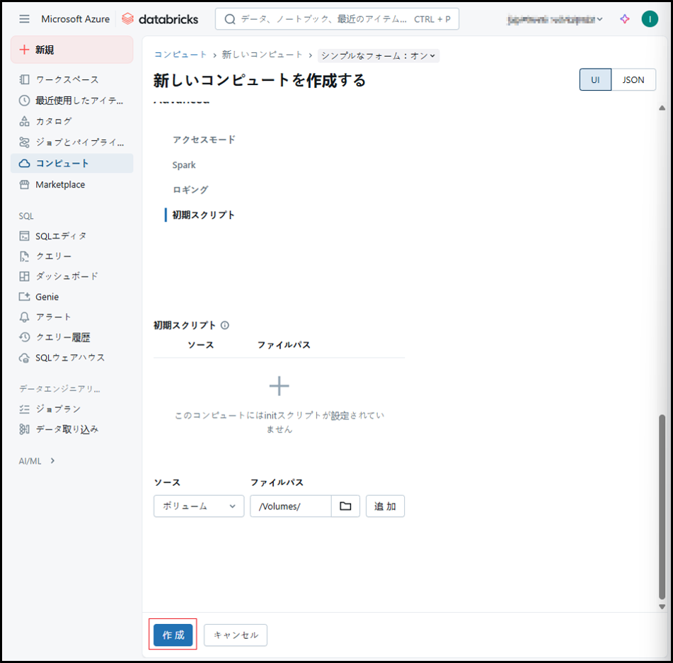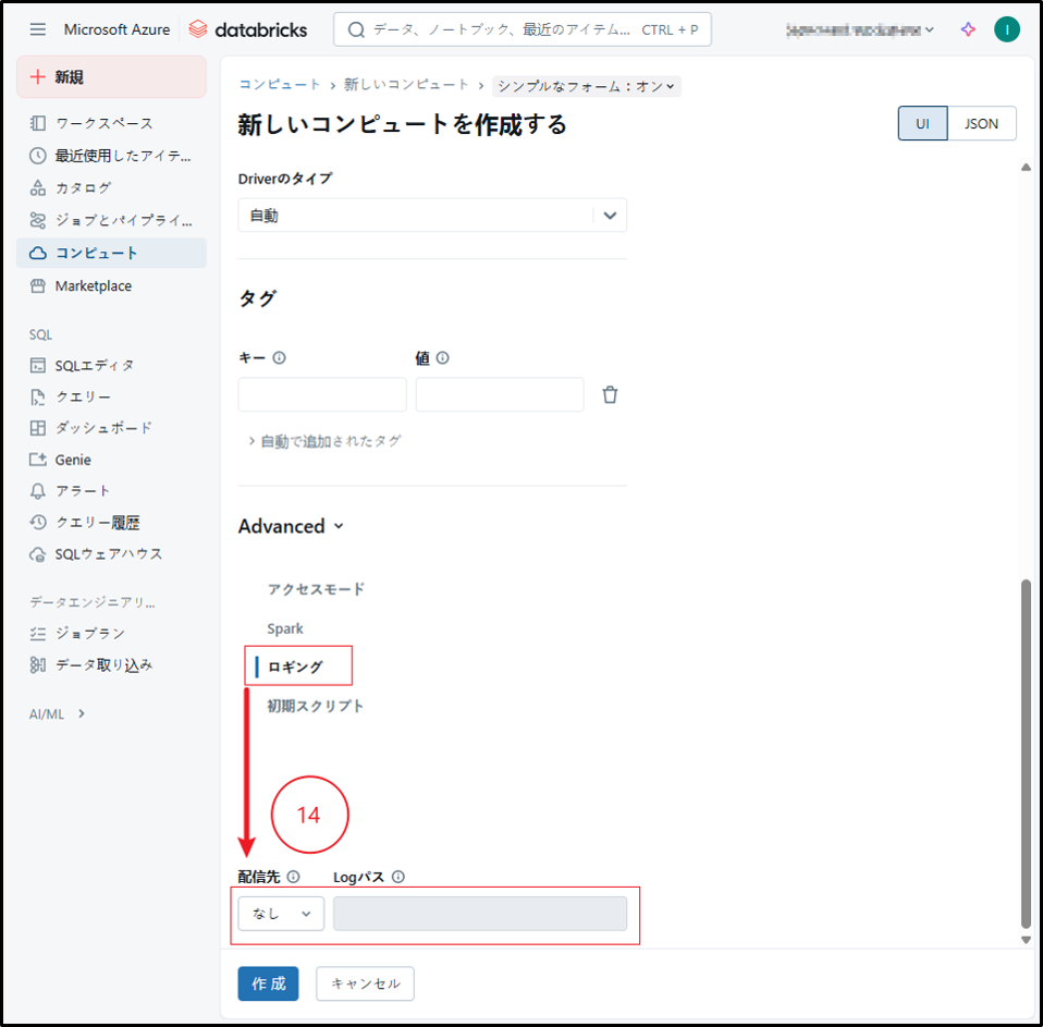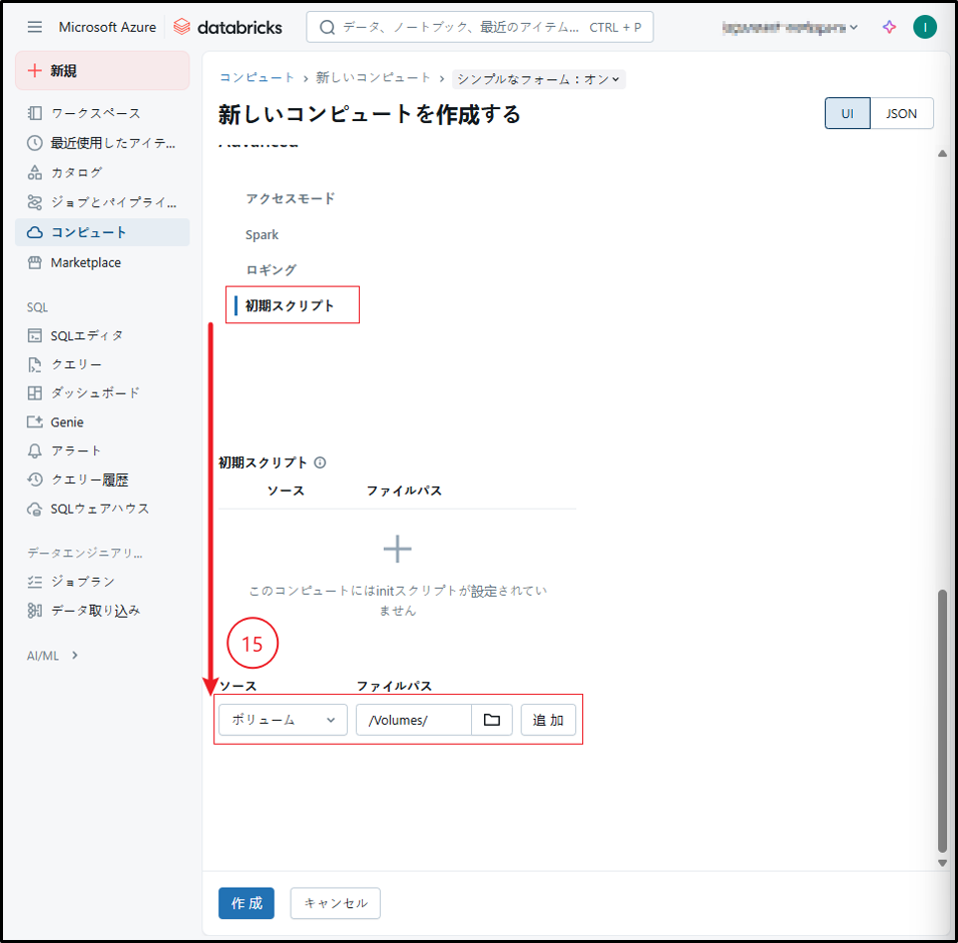 ③ 既存のライブラリを使用して機械学習用のDatabrick runtimeを選択する場合、「機械学習」のチェックボックスをオンにします。