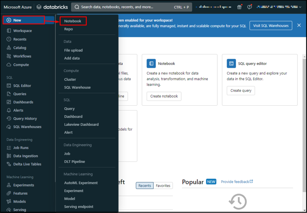 ⑧ Databricksワークスペース画面から -> [New] -> [Notebook]