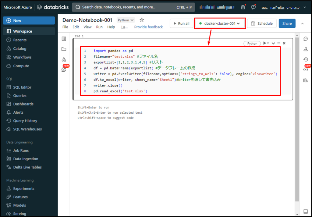 ⑨ 作成したクラスタを選択し、ノートブックを実行します。以下のコマンドを入力して、[Shift + Enter]を押します。