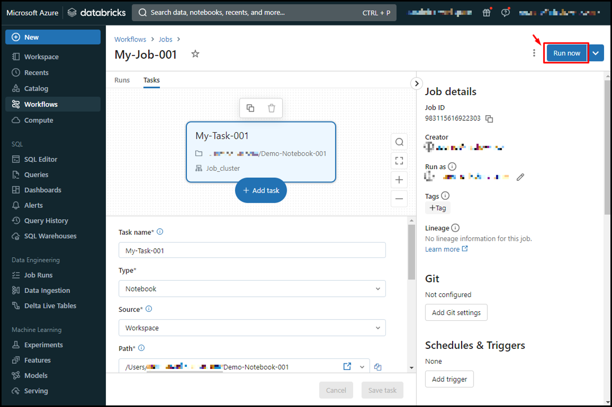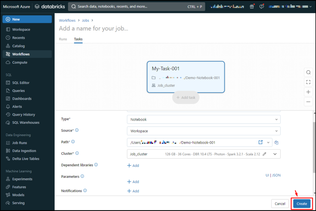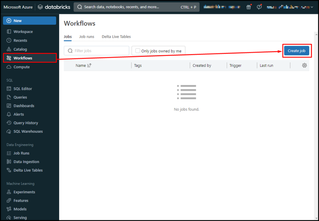 ① Databricksワークスペース画面から、[Workflows] -> [Create job]をクリックします。