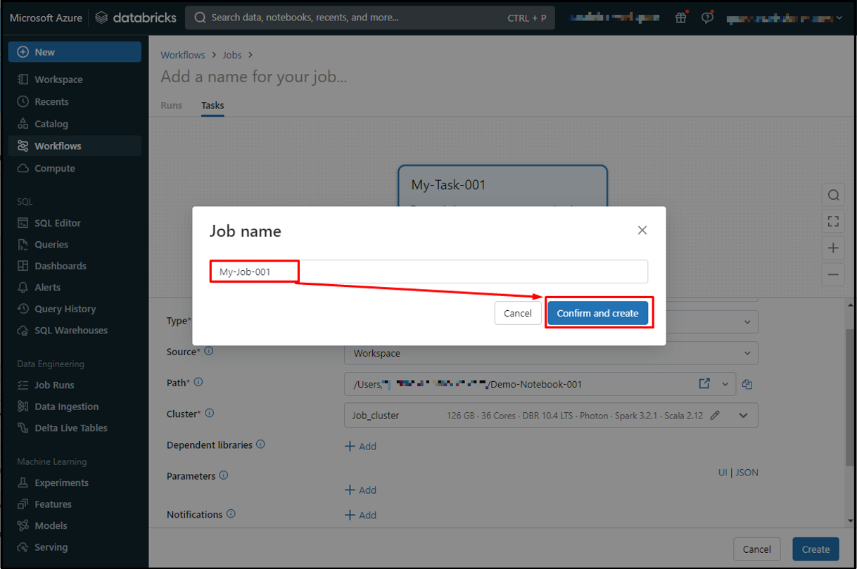 ⑤ ジョブ名を入力して、[Confirm and create]をクリックします。