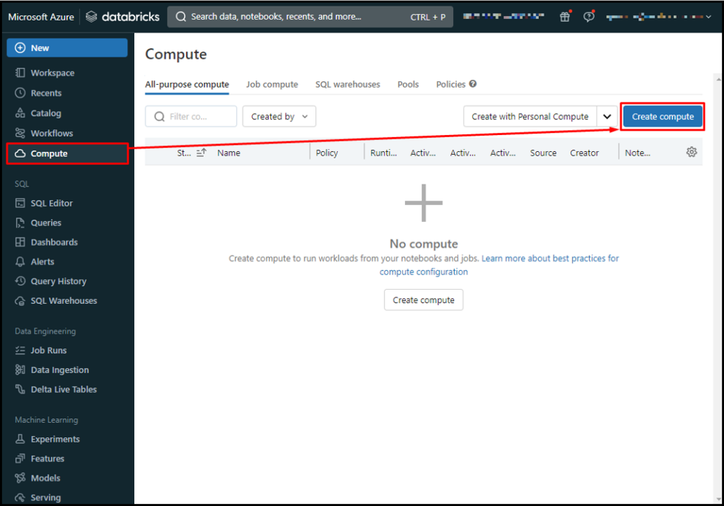 ① Databricks画面から、[Compute] -> [Create compute]をクリックします。