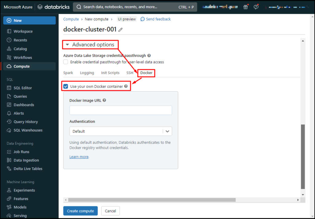 - Databricks container services は、共有アクセス モードを使用するクラスターではサポートされていません。