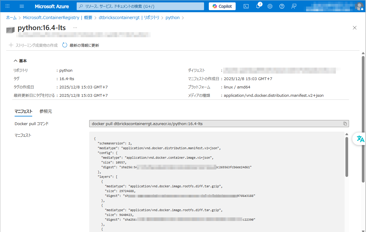 Docker HubからAzureコンテナーレジストリへ「python:16.4-LTS」イメージをインポートするには、Azureコンテナーレジストリにログインが必要です。